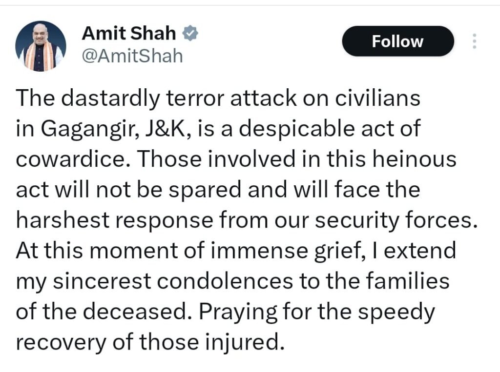 In a post on X, he wrote: “I strongly condemn the heinous terrorist attack on civilians in Gagangeer. I assure the people that those behind this despicable act will not go unpunished. We have given full freedom to J&K Police, Army and Security forces. Our brave personnel are on the ground & they will ensure terrorists pay a very heavy price for their action. My heartfelt condolences to bereaved families. Praying for speedy recovery of the injured. The entire nation stands in solidarity with the families in this hour of grief”.TDD
