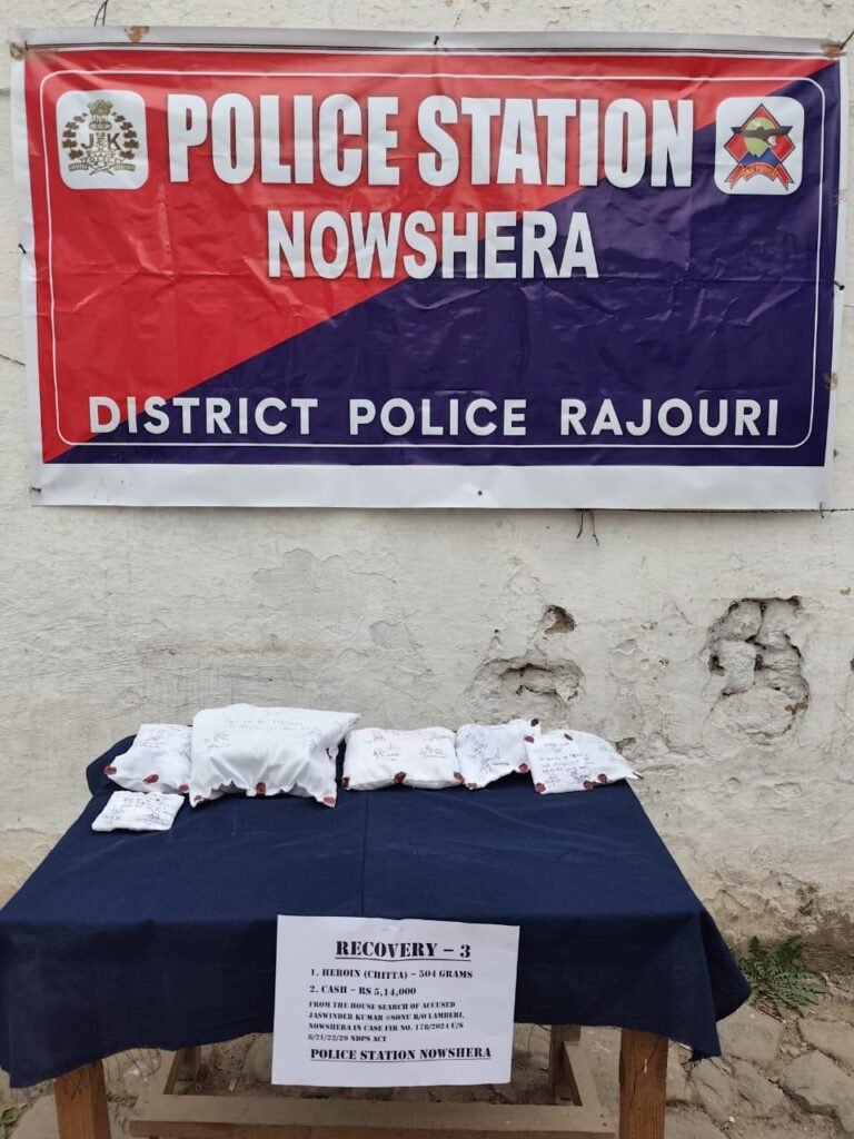 “In a significant breakthrough against drug trafficking Nowshera Police during search of the residential house of accused namely Jaswinder Kumar alias Sonu at Lamberi in Nowshera police party headed by SHO Nowshera Inspector Arjun Magotra, recovered more 504 grams of heroin-like substance and cash Rs 5 lakh and 14 thousand from the house of accused Sonu,” reads a statement issued by the police.