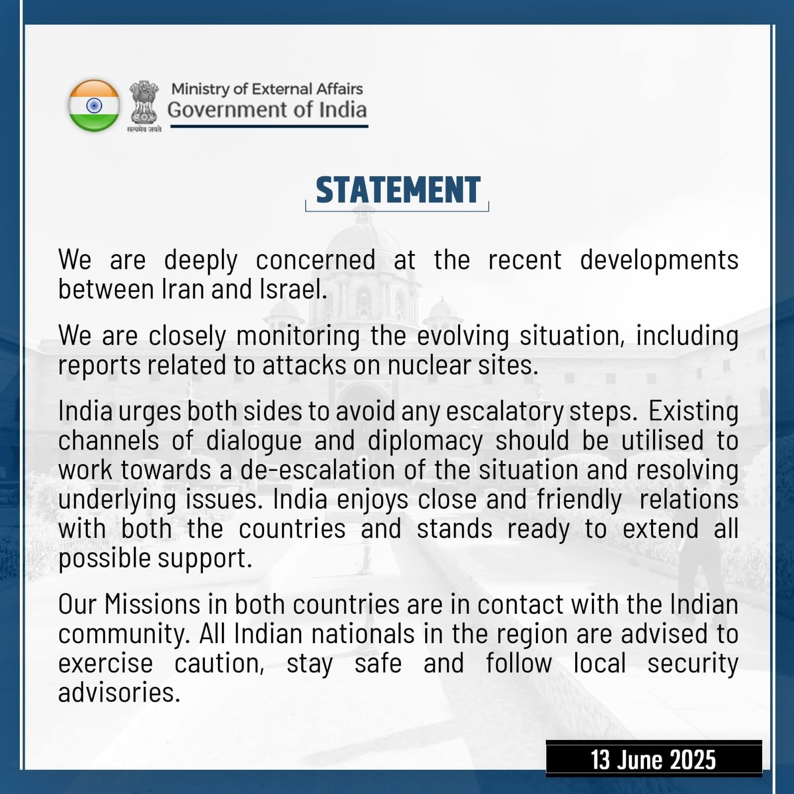 LATEST NEWS J&K Expands Healthcare: 2 AIIMS, 12 Medical Colleges, and 3,100+ Wellness Centres Strengthen Grassroots Services Indian Army Established Youth Activity Centre at Chhatroo, Kishtwar Under Operation Sadbhavana Special Edition of Sangarmal Magazine launched in Jammu Veterans’ Day Celebration Honours the Spirit of Service and Sacrifice African Strategic Worries: UAE Seen as “Invisible” Ally of Israel as Somalia Cancels All Agreements World Less than 1 min.Read Ministry of external affairs, Government of India By Diplomat Digital June 13, 2025 FacebookTwitterPinterestWhatsApp Hot this week India J&K Expands Healthcare: 2 AIIMS, 12 Medical Colleges, and 3,100+ Wellness Centres Strengthen Grassroots Services January 13, 2026 0 Diplomat Correspondent JAMMU, (India): Jammu and Kashmir is witnessing... Chenab Valley Indian Army Established Youth Activity Centre at Chhatroo, Kishtwar Under Operation Sadbhavana January 13, 2026 0 Diplomat Correspondent Kishtwar: The Indian Army continues its sustained... Jammu Special Edition of Sangarmal Magazine launched in Jammu January 13, 2026 0 J&K's rich spiritual heritage is a dynamic asset since... Pir Panjal Veterans’ Day Celebration Honours the Spirit of Service and Sacrifice January 13, 2026 0 Diplomat Correspondent Rajouri: The 10th Veterans’ Day celebrations commenced... Africa African Strategic Worries: UAE Seen as “Invisible” Ally of Israel as Somalia Cancels All Agreements January 13, 2026 0 Nasir AliMogadishu: Tensions are mounting on the African continent... Topics India J&K Expands Healthcare: 2 AIIMS, 12 Medical Colleges, and 3,100+ Wellness Centres Strengthen Grassroots Services 0 Diplomat Correspondent JAMMU, (India): Jammu and Kashmir is witnessing... Chenab Valley Indian Army Established Youth Activity Centre at Chhatroo, Kishtwar Under Operation Sadbhavana 0 Diplomat Correspondent Kishtwar: The Indian Army continues its sustained... Jammu Special Edition of Sangarmal Magazine launched in Jammu 0 J&K's rich spiritual heritage is a dynamic asset since... Pir Panjal Veterans’ Day Celebration Honours the Spirit of Service and Sacrifice 0 Diplomat Correspondent Rajouri: The 10th Veterans’ Day celebrations commenced... Africa African Strategic Worries: UAE Seen as “Invisible” Ally of Israel as Somalia Cancels All Agreements 0 Nasir AliMogadishu: Tensions are mounting on the African continent... Ladakh Road Safety: Night Naka Checking in Leh 0 Diplomat Correspondent Leh: As part of the ongoing Road... Jammu Expert Lecture on the topic ‘Spiritualizing Life and Living’ held at University of Jammu 0 Diplomat Correspondent Jammu: Commemorating the birth anniversary of Swami... Jammu Jammu University celebrates Lohri in campus 0 Diplomat Correspondent JAMMU: Reflecting the spirit of India’s heritage... Related Articles The Amazon: From Carbon Sink to Carbon Source Climate December 29, 2025 Israel Formally Recognizes Republic of Somaliland as a ‘Sovereign Nation’ Drawing New Strategically Located Frontline on Red Sea Politics & Diplomacy December 28, 2025 Peace Returns on Cambodian and Thailand Borders After 20-Days of Military Clashes Politics & Diplomacy December 28, 2025 Videberg Kraft AB applies for state aid to build nuclear power World December 25, 2025 Ukrainian Peace Negotiator Resigns Amid Corruption Charges World December 25, 2025 Previous articleJ&K Gears Up for 5th National Chief Secretaries’ Conference; Nodal Officers Appointed for Key Education and Youth ThemesNext articleUnimaginable Tragedy’: CM Omar Abdullah Mourns Air India Crash, Demands Probe; Criticises Global Silence on Israel’s Strike on Iran