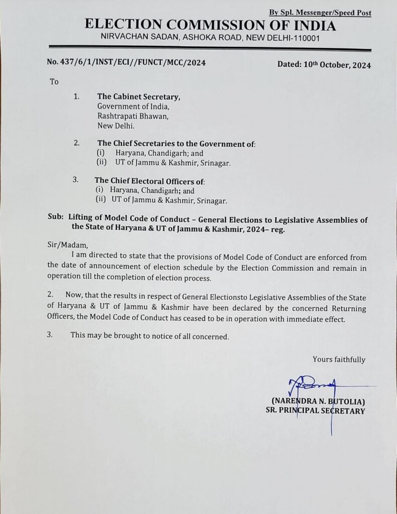 Jammu :TDD, The Election Commission of India has officially lifted the Model Code of Conduct in Haryana and the Union Territory of Jammu & Kashmir following the declaration of results for their respective Legislative Assembly elections. In a letter dated October 10, 2024, the Commission informed key government officials that the code, which had been in effect since the announcement of the election schedule, has now ceased to be operational with immediate effect.