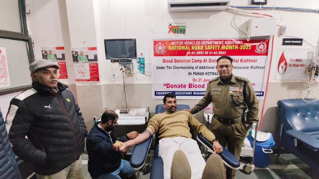Kishtwar,DD, The Motor Vehicles Department (MVD) Kishtwar under the overall supervision of Transport Commissioner Vishesh Mahajan JKAS organizes blood donation camp at District Hospital Kishtwar.This initiative was a part of the ongoing celebration of National Road Safety Month 2025.The event was graced by the presence of chief guest ADC Kishtwar Pawan Kotwal JKAS in presence of DySP DR Kishtwar Sajad Khan & Major Akshay from 7 Assam Rifles.ADC Kishtwar applauds the efforts of ARTO Kishtwar Tasleem Wani JKAS and other stakeholders in organising the blood donation camp.