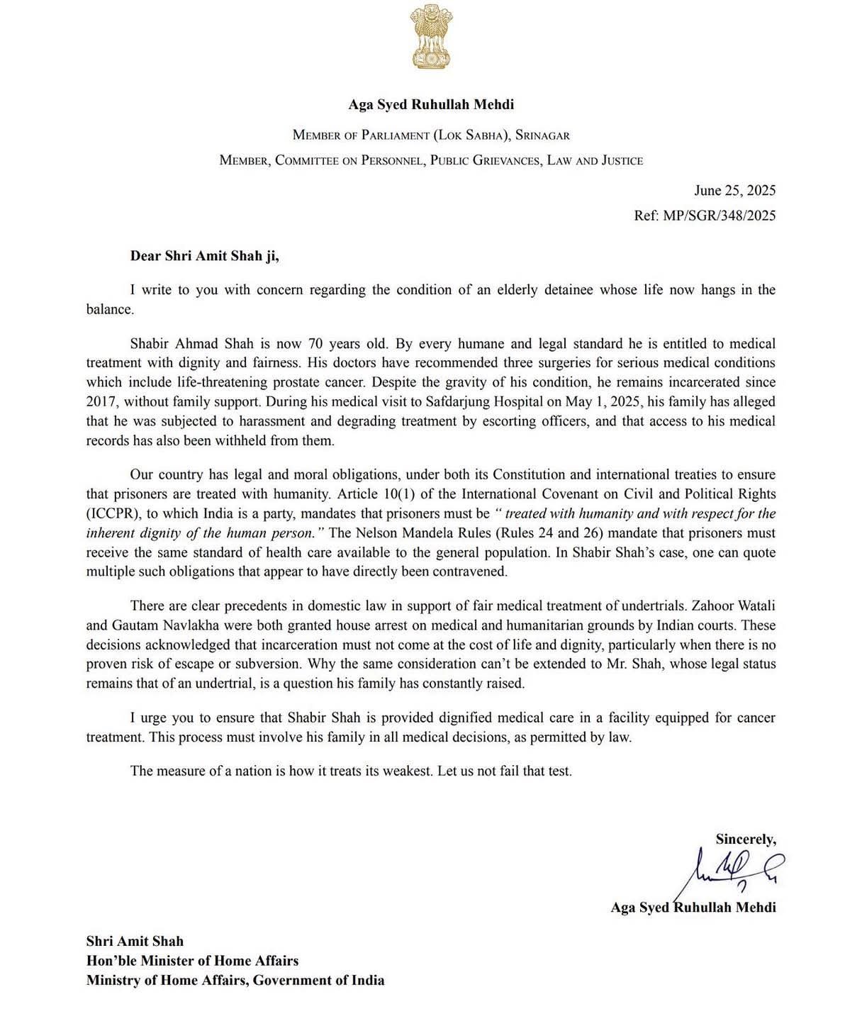 MP Ruhullah Mehdi writes to Home Minister Amit Shah about the case of Shabir Ahmad Shah.