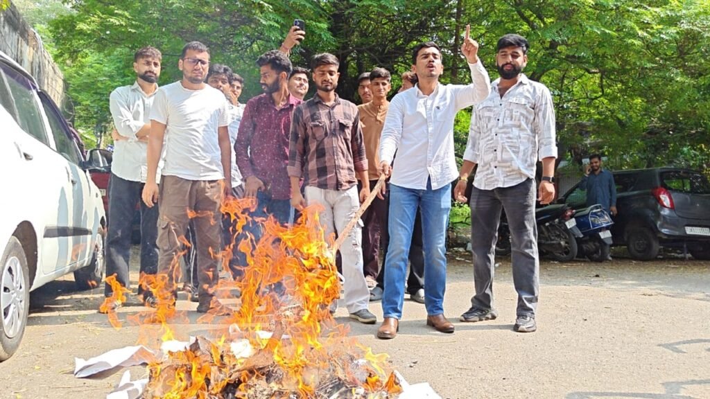 Jammu,DD: The National Students’ Union of India (NSUI) Jammu Kashmir unit today staged a vehement protest outside the BJP headquarters in Jammu, burning the effigy of former Jammu Municipal Corporation (JMC) Mayor and BJP leader Chander Mohan Gupta.