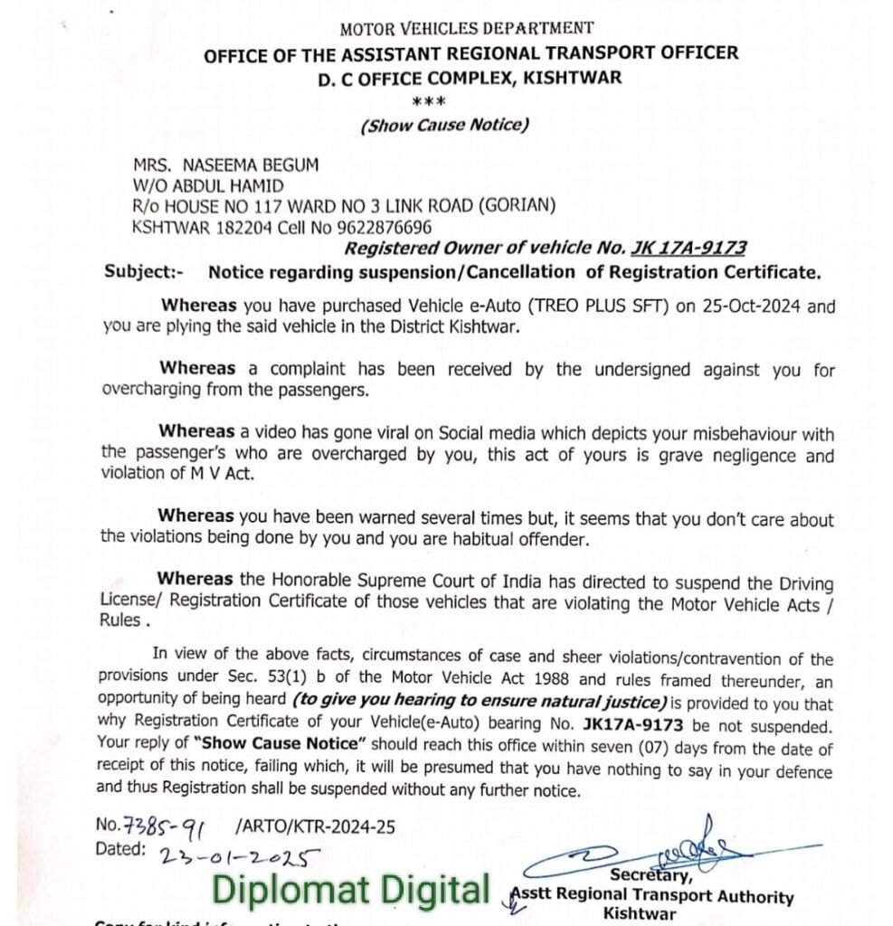 Office of the Assistant Regional Transport Officer D.C office complex Kishtwar Diplomat Digital 12 months ago Oplus_0 Diplomat Desk