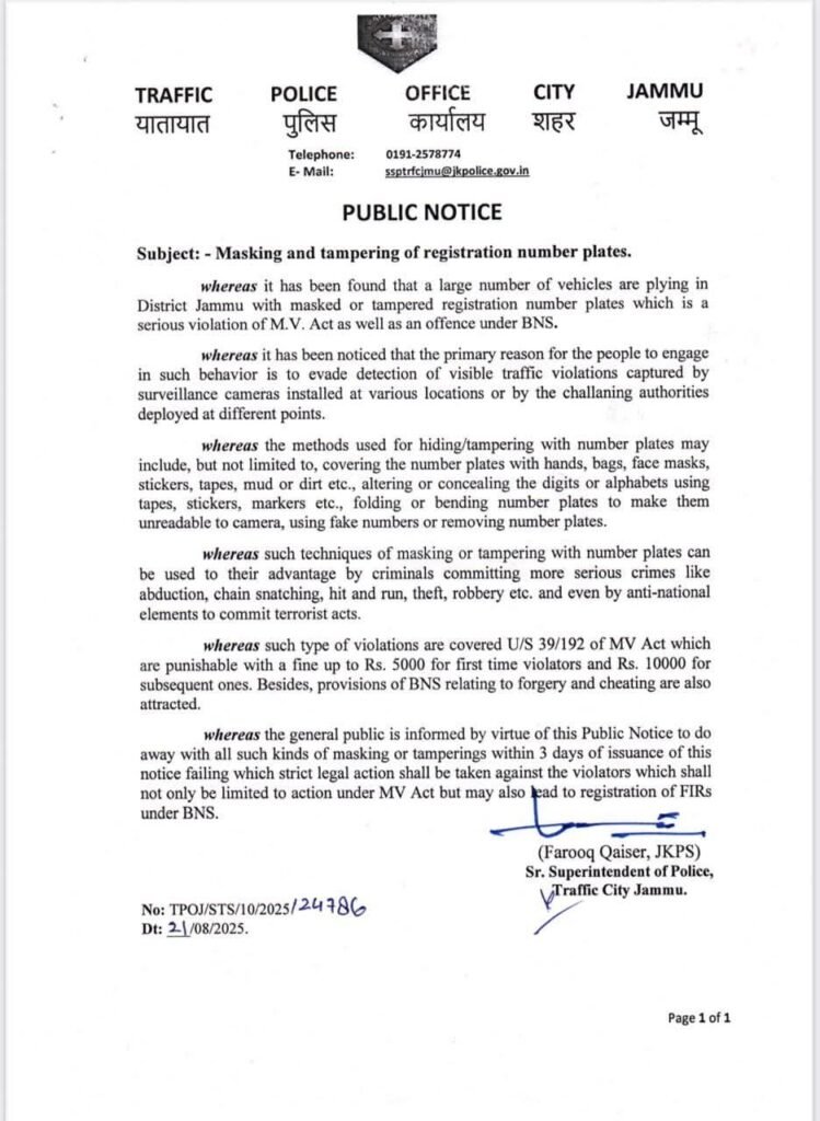 On the recommendation of Traffic SSP Jammu, Farooq Qaiser, FIRs to be lodged against those masking or tampering with Registration Number Plates Diplomat Digital 6 months ago