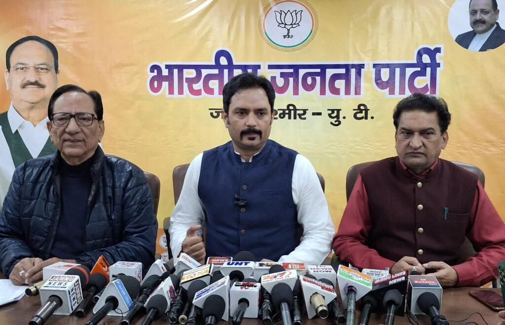 Dr. Abhijeet Jasrotia accompanied by BJP Spokespersons Balbir Ram Rattan & YV Sharma, was addressing a press conference at party headquarters, Trikuta Nagar.