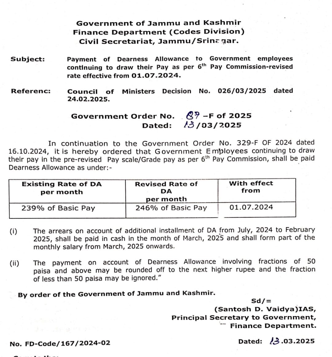 LATEST NEWS The Nation’s Water, the Nation’s Light and Prosperity Exploration of colour and memory Indian Coast Guard Busts International Oil Smuggling Racket Industry Speaks: Praise with a Warning Anjumans holds Protest in Jammu Against Shia Genocide in Pakistan Jammu Less than 1 min.Read Payment of Dearness Allowance to Govt Employees By Diplomat Digital March 13, 2025 FacebookTwitterPinterestWhatsApp Hot this week Edit/Opinion The Nation’s Water, the Nation’s Light and Prosperity February 9, 2026 0 It is a welcome and far-reaching step that serious... Features Exploration of colour and memory February 8, 2026 0 The Yellow Metaphor, a poetry collection by Jiban Narah... India Indian Coast Guard Busts International Oil Smuggling Racket February 8, 2026 0 New Delhi: The Indian Coast Guard (ICG) successfully busted... Edit/Opinion Industry Speaks: Praise with a Warning February 8, 2026 0 It is only natural for political parties to attack... Jammu Anjumans holds Protest in Jammu Against Shia Genocide in Pakistan February 8, 2026 0 Jammu: Shia Anjumans of the Jammu Province on Friday... Topics Edit/Opinion The Nation’s Water, the Nation’s Light and Prosperity 0 It is a welcome and far-reaching step that serious... Features Exploration of colour and memory 0 The Yellow Metaphor, a poetry collection by Jiban Narah... India Indian Coast Guard Busts International Oil Smuggling Racket 0 New Delhi: The Indian Coast Guard (ICG) successfully busted... Edit/Opinion Industry Speaks: Praise with a Warning 0 It is only natural for political parties to attack... Jammu Anjumans holds Protest in Jammu Against Shia Genocide in Pakistan 0 Jammu: Shia Anjumans of the Jammu Province on Friday... Article The Indelible Hills: Why Pir Panjal and Chenab Valley Cannot Be Erased 0 If geography is destiny, then the mountains of Jammu... Features Reinventing a forgotten pioneer of modern India 0 The lost case of Dr Jamini Sen, one of... Jammu J&K Struggles With Two Contradictory Demands: Restoration of Statehood to J&K vs Separate Statehood to Jammu 0 Jammu, J&K (India): Jammu and Kashmir has been grappling... Related Articles Anjumans holds Protest in Jammu Against Shia Genocide in Pakistan Jammu February 8, 2026 The Indelible Hills: Why Pir Panjal and Chenab Valley Cannot Be Erased Article February 6, 2026 J&K Struggles With Two Contradictory Demands: Restoration of Statehood to J&K vs Separate Statehood to Jammu Jammu February 6, 2026 Two Terrorists Neutralised in J&K’s Basantgarh Forests Jammu February 4, 2026 Balloons, Birds, and Suspected Drone Activities Pose Security Challenges Along the Indo-Pakistan Border Jammu February 4, 2026 Previous articleARTO Kishtwar Suspends Permits of 9 Vehicles, Blacklists 30 Vehicles, and Suspends 10 Driving LicensesNext articleJ&K POLICE DISTRICT KISHTWAR OBSERVED “THANA DIVAS”; SSP KISHTWAR SHARES INSIGHTS ON NEW CRIMINAL LAWS