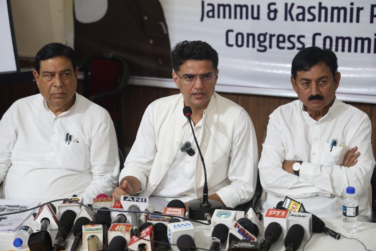 Flanked by AICC Secretary Co Incharge Manoj Yadav, JKPCC Senior Vice President & Chief Spokesperson Ravinder Sharma, AICC Media Coordinators Dolly Sharma, Onika Mehrotra, Pilot also highlighted the Congress party’s alliance with the National Conference, aimed at providing a strong alternative to the BJP in Jammu and Kashmir.