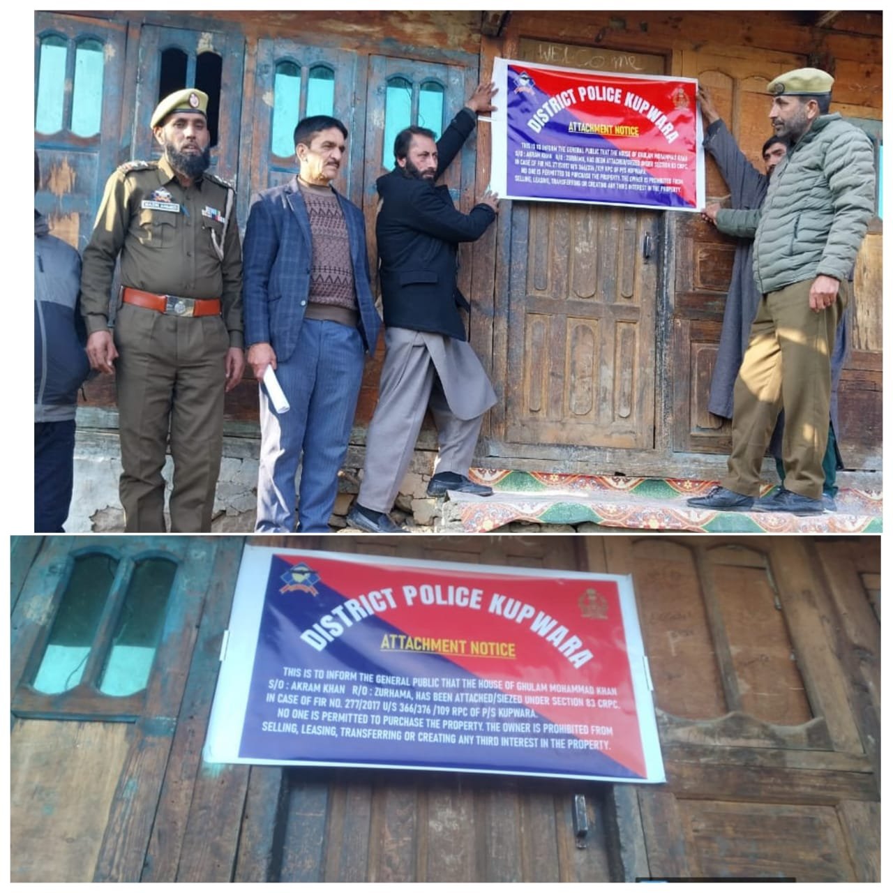 Police said the property, (residential house) located in Chek Zirhama, belongs to the accused Gh Mohd Khan, son of Akran Khan, who is wanted in connection with Case FIR No. 277/2017 under Sections 366, 376, 109 RPC of Police Station Kupwara. Despite repeated summons and a proclamation issued under Section 82 CrPC, the accused has evaded legal proceedings, prompting the court to authorize the attachment as a measure to compel his surrender.