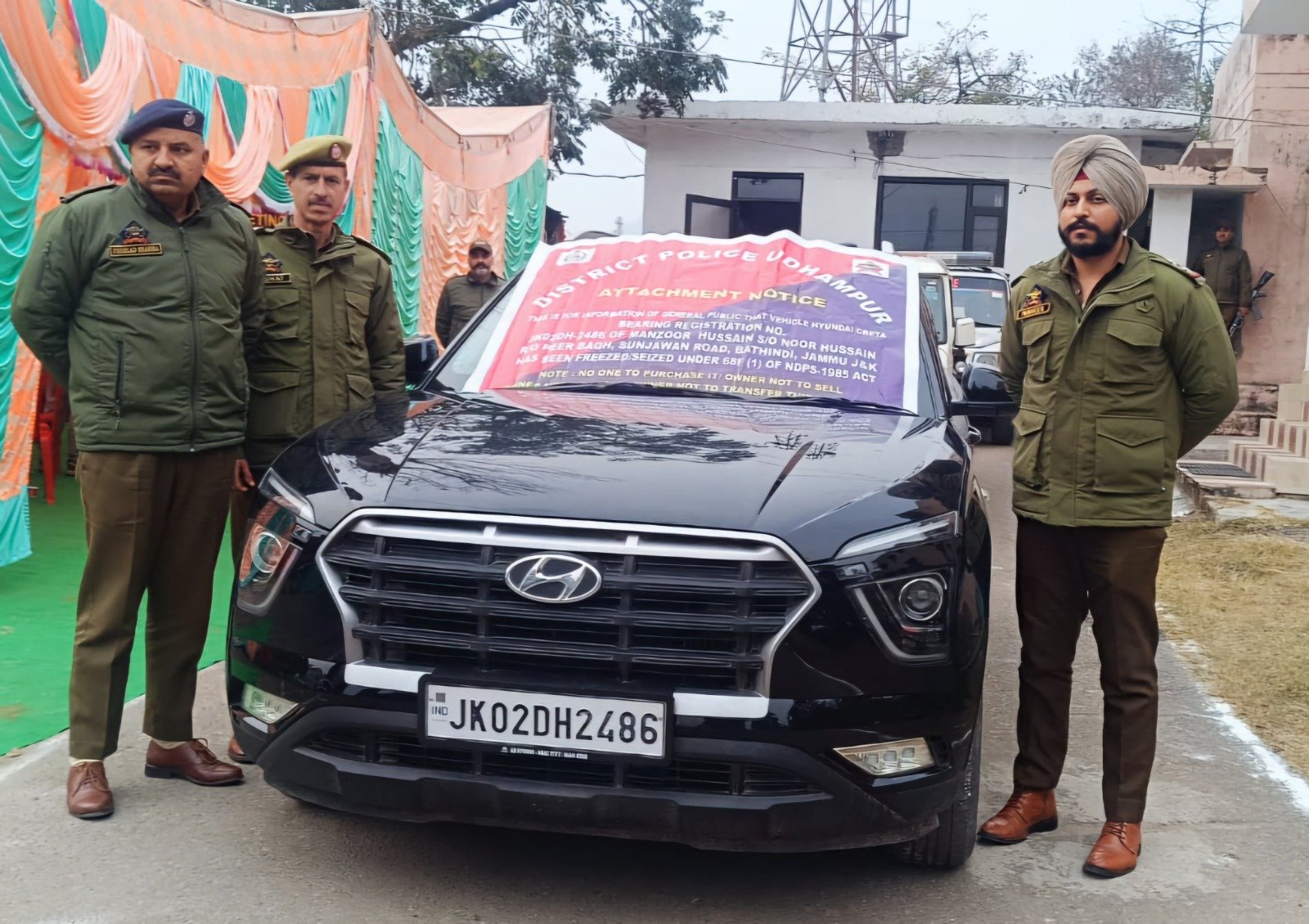 Udhampur:DD,As a part of its relentless effort against drug peddlers/smugglers, Udhampur Police has executed an attachment operation by PP Tikri resulting in the freezing/seizure of Creta Car bearing Regd. No. JK02DH-2486 worth rupees 20 lakhs approximately owned by drug Peddler namely Mohd Hafiz, son of Jhullas, Poonch.