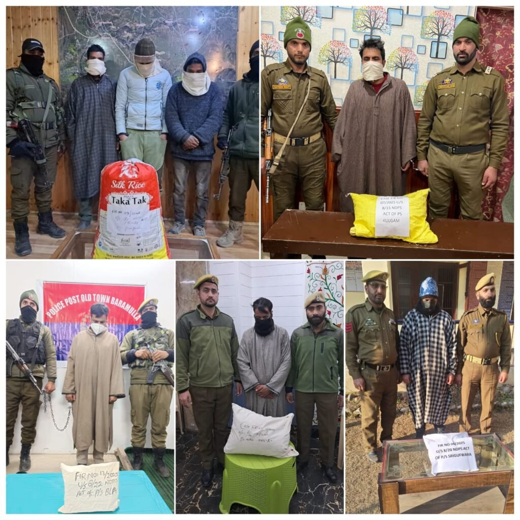 The arrests span Kulgam, Baramulla, Anantnag and Awantipora, with police also detaining a notorious drug dealer under the Prevention of Illicit Traffic in Narcotic Drugs and Psychotropic Substances (PIT-NDPS) Act in Kupwara.