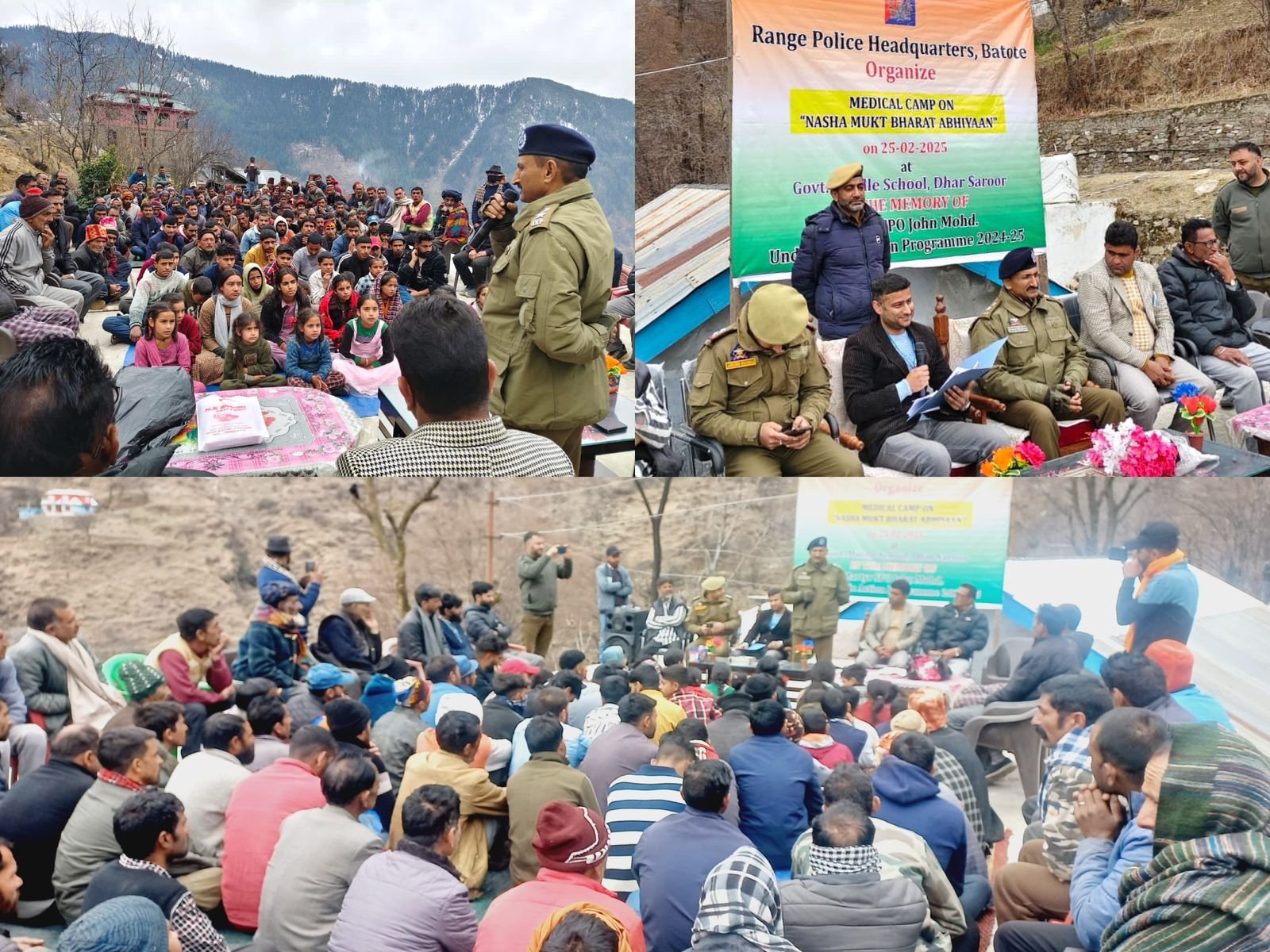Kishtwar, DD: On the directions of DIG DKR Range, Shridhar Patil-IPS, J&K Police District Kishtwar organized a Nasha Mukti Abhiyaan at Government Middle School, Dhar Saroor, in memory of Martyr SPO Jahn Mohd under the Civic Action Programme.The event was led by Addl. SP Kishtwar Pawan Kumar-JKPS, who was accompanied by Dr. Varun Gupta, Medical Officer Drabshalla, and other prominent figures of the area. Addressing the gathering, Addl. SP Kishtwar emphasized the grave consequences of drug abuse on individuals, families, and society. He reiterated the strict legal action against those involved in drug trafficking and consumption.The programme saw an overwhelming response with nearly 250 participants, including students, teachers, and locals. An awareness session was conducted on the physical, psychological, and social impacts of drug addiction. Addl. SP Kishtwar urged parents to remain vigilant and involved in their children’s lives to prevent them from falling into the trap of substance abuse.J&K Police Kishtwar reaffirmed its commitment to a drug-free society and assured that such awareness campaigns will continue across the district. DD