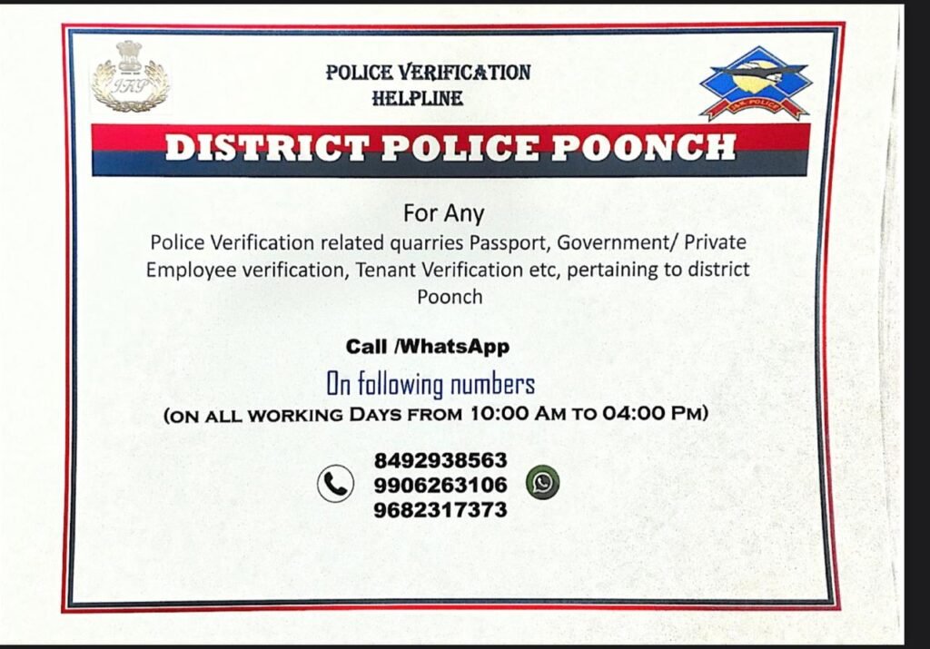 Poonch,TDD,In a significant step towards enhancing citizen services and ensuring public convenience, the Poonch Police has launched dedicated helpline numbers to assist residents with all kinds of verifications. This initiative is part of the Poonch Police’s commitment to fostering transparency, efficiency, and citizen-centric policing.