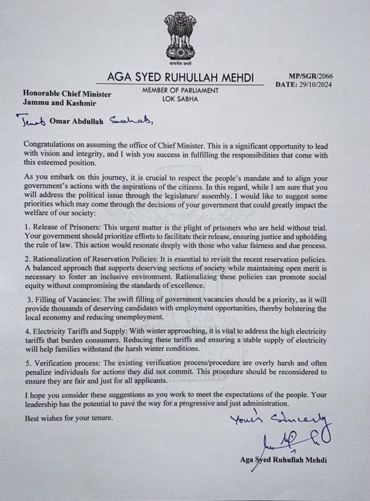 Srinagar, Oct 29 (TDD): Member of Parliament Srinagar-Budgam constituency, Aga Syed Ruhullah Mehdi today shot a letter to J&K Chief Minister Omar Abdullah, suggesting him to prioritize the issues of release of political prisoners, filling of vacancies and reducing the power tariff.