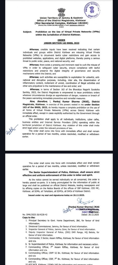 Prohibition on the Use of Virtual Private Networks (VPNs) within the Jurisdiction of District Kishtwar. Diplomat Digital 3 months ago