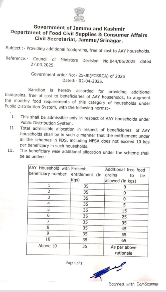Providing additional foodgrains, free of cost AAY households