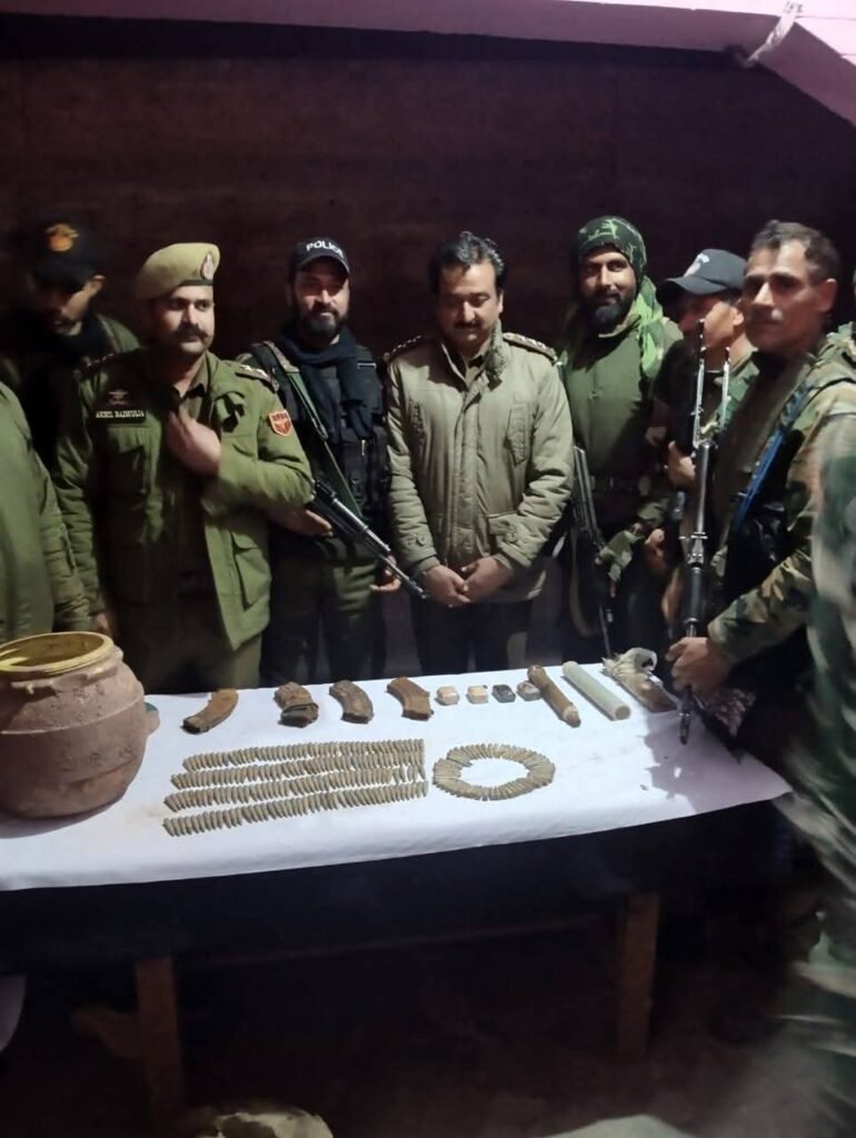 A joint team of Reasi Police and 126 CRPF Bn. after receiving a specific input, launched search and cardon operations in the forest area of Jamslan area of Sub-Division Mahore and recovered arms and ammunition under a tree covered with blanket in forests of Simbli Jamslan, Mahore.