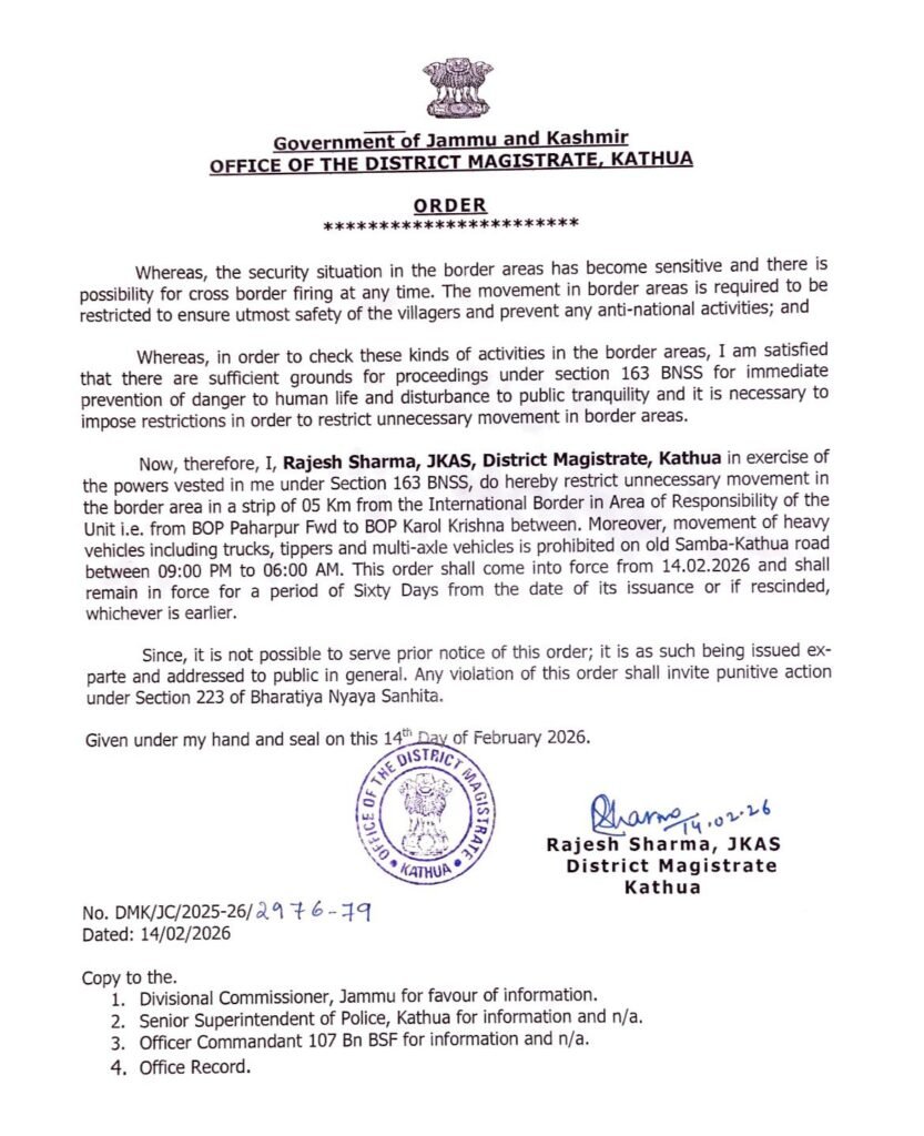 Accordingly, the DM Kathua further states in his order: “…I am satisfied that there are sufficient grounds for proceedings under Section 163 BNSS for the immediate prevention of danger to human life and disturbance to public tranquillity, and it is necessary to impose restrictions on unnecessary movement in the border areas.”