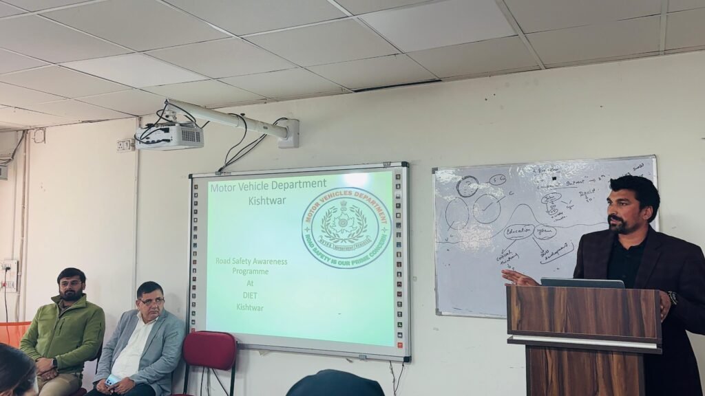 Kishtwar,DD, Continuing its efforts to promote a culture of safety and awareness, the Motor Vehicles Department Kishtwar organized a Road Safety Awareness Session at DIET Kishtwar under the supervision of Deputy Commissioner Kishtwar, Pankaj Kumar Sharma (JKAS) and Transport Commissioner J&K, Vishesh Paul Mahajan (JKAS). The session was led by ARTO Kishtwar, Tasleem Wani (JKAS).