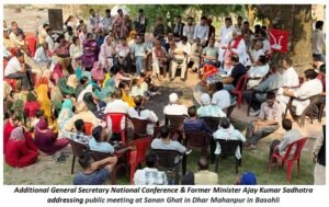 Diplomat Correspondent Jammu, DD, National Conference Additional General Secretary, Mr. Ajay Kumar Sadhotra, today cautioned against politicizing the heroicachievements of the Indian Armed Forces, emphasizing that their recent success in thwarting the misadventure of Pakistan is a collective victory of the entire nation.Addressing a public meeting at Sanan Ghat, Dhar Mahanpur in Basohli, which was … Continue reading Sadhotra cautions against politicizing armed forces’ heroism in Op Sindoor; terms it victory of entire nation