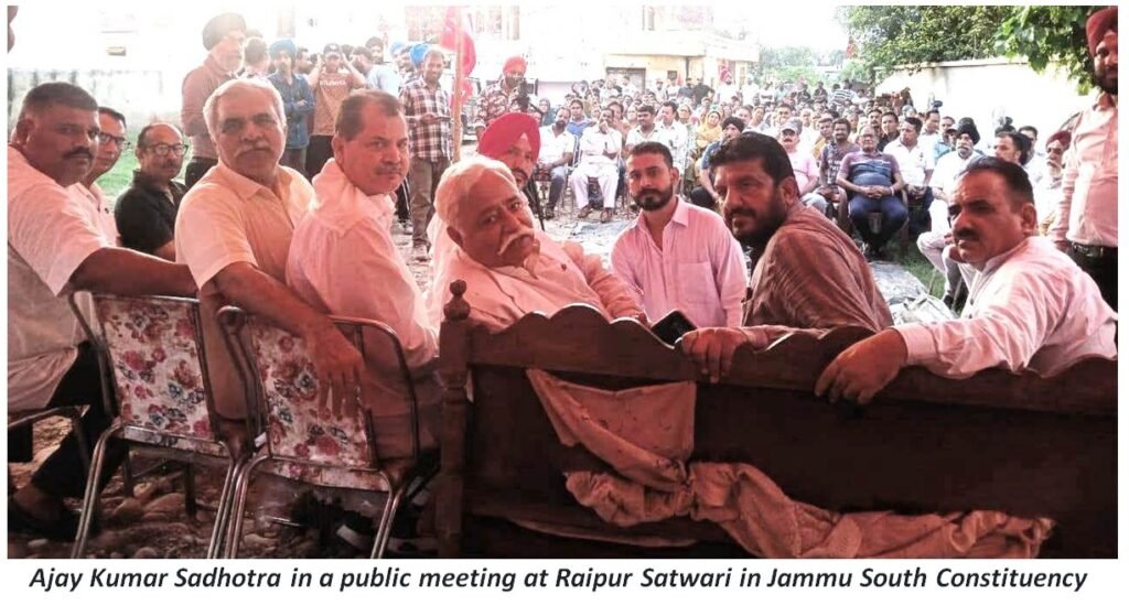 Addressing a public meeting at Raipur (Satwari) in Jammu South Constituency which was organized by Jatinder Singh Lucky, Akshay Kumar and Ginni Singh. Mr Sadhotra said that the people of Jammu and Kashmir are bearing the brunt of a dual administrative control that lacks accountability and responsiveness. The governance has taken a serious hit. Decisions that affect the everyday lives of citizens are either delayed or lost in bureaucratic Wrangles, he said, adding that this system is no substitute for the inherent powers of a democratically elected government. Dual administrative control has created chaos and confusion.