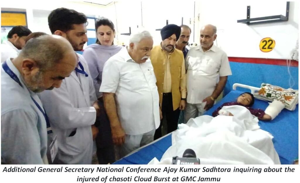 JAMMU,DD, National Conference Additional General Secretary and former Minister Mr Ajay Kumar Sadhotra today visited GMC Hospital Jammu here to enquire about the health status of the injured pilgrims of the Machail Mata Yatra, who sustained injuries in the tragic cloudburst at Chasoti village in Kishtwar district.