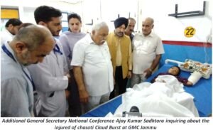 Diplomat Correspondent JAMMU,DD, National Conference Additional General Secretary and former Minister Mr Ajay Kumar Sadhotra today visited GMC Hospital Jammu here to enquire about the health status of the injured pilgrims of the Machail Mata Yatra, who sustained injuries in the tragic cloudburst at Chasoti village in Kishtwar district. Mr Sadhotra interacted with the injured … Continue reading Sadhotra visits GMC Jammu, enquires about health status of Machail Mata pilgrims in Chasoti cloudburst