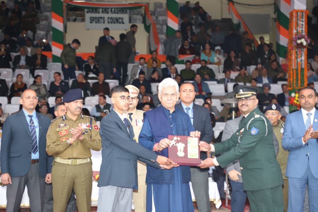 Shri Manoj Sinha, Hon’ble Lieutenant Governor of the Union Territory of Jammu & Kashmir, presented the coveted trophy to Lt Col Amit Selot, Officiating Principal, and Cadet Uday Kumar, Band Contingent Captain, after the grand Beating Retreat Ceremony on 29th January 2025.