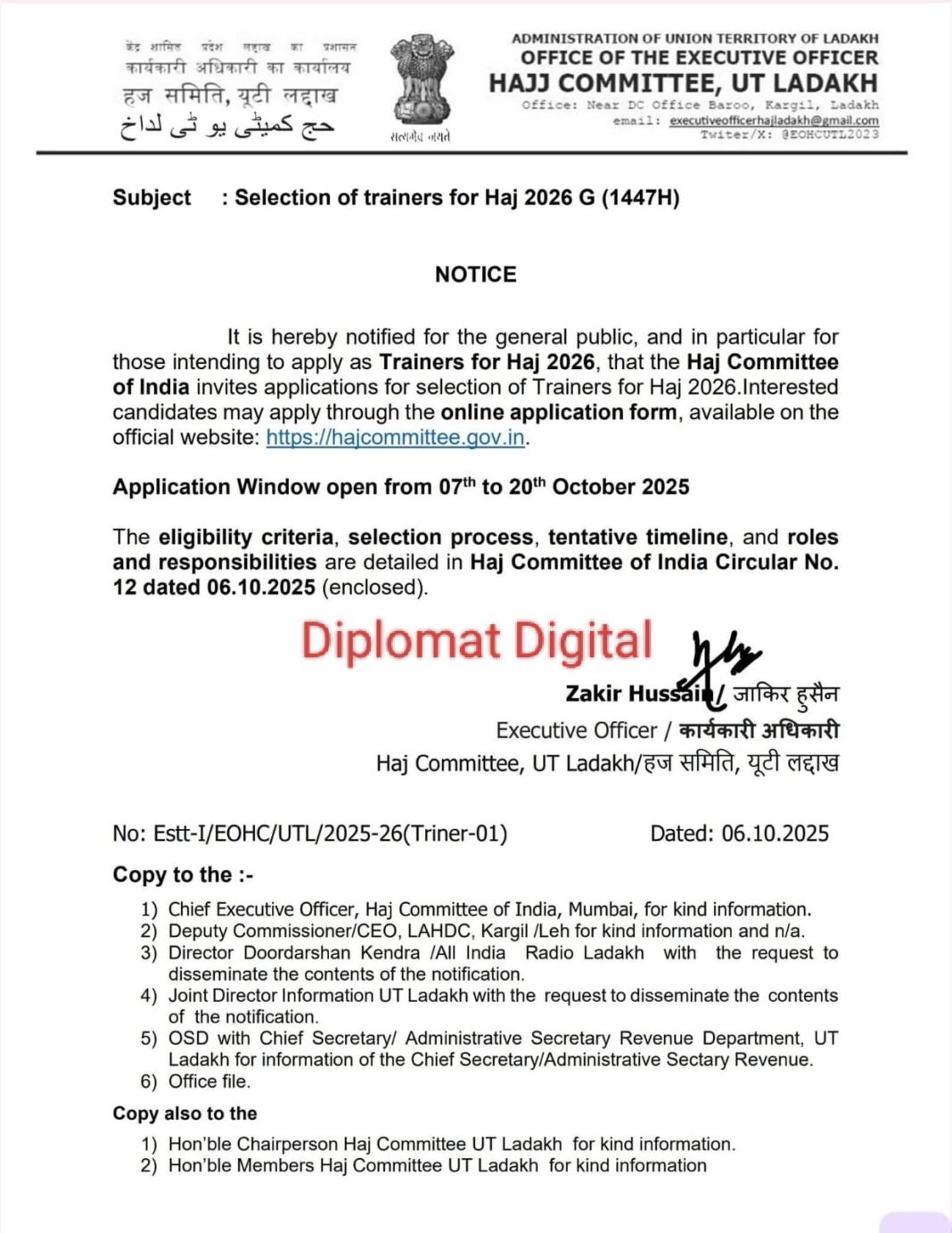 It is hereby notified for the general public, and in particular for those intending to apply as Trainers for Haj 2026, that the Haj Committee of India invites applications for selection of Trainers for Haj 2026. Interested candidates may apply through the online application form, available on the official website: https://hajcommittee.gov.in.