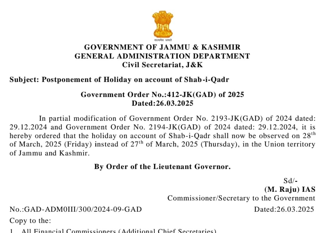 LATEST NEWS Research on the Bakarwal Tribe: A Historic Step Toward Inclusive Policy-Making Altaf Bukhari Advocates United J&K, Slams Demand for Separate Jammu State India’s AI Pathway: Reimagining Global Leadership from the Global South Grand Mufti of India Sheikh Abubakr Ahmad meets Prime Minister Narendra Modi LG Orders Immediate Reopening of 11 Tourist Spots in Kashmir, 3 in Jammu Division JammuKashmir Less than 1 min.Read Shab-i-Qadr holiday postponed By Diplomat Digital March 27, 2025 FacebookTwitterPinterestWhatsAppEmailPrintTelegram Hot this week Edit/Opinion Research on the Bakarwal Tribe: A Historic Step Toward Inclusive Policy-Making February 18, 2026 0 The initiation of a longitudinal research project on the... Jammu Altaf Bukhari Advocates United J&K, Slams Demand for Separate Jammu State February 17, 2026 0 Jammu: Apni Party President Syed Mohammad Altaf Bukhari today... Article India’s AI Pathway: Reimagining Global Leadership from the Global South February 17, 2026 0 Nitin Upadhyay We are framing the India AI story within... India Grand Mufti of India Sheikh Abubakr Ahmad meets Prime Minister Narendra Modi February 17, 2026 0 New Delhi: Grand Mufti of India Sheikh Abubakr Ahmad... Jammu LG Orders Immediate Reopening of 11 Tourist Spots in Kashmir, 3 in Jammu Division February 16, 2026 0 Jammu: Lieutenant Governor Manoj Sinha on Monday ordered the... Topics Edit/Opinion Research on the Bakarwal Tribe: A Historic Step Toward Inclusive Policy-Making 0 The initiation of a longitudinal research project on the... Jammu Altaf Bukhari Advocates United J&K, Slams Demand for Separate Jammu State 0 Jammu: Apni Party President Syed Mohammad Altaf Bukhari today... Article India’s AI Pathway: Reimagining Global Leadership from the Global South 0 Nitin Upadhyay We are framing the India AI story within... India Grand Mufti of India Sheikh Abubakr Ahmad meets Prime Minister Narendra Modi 0 New Delhi: Grand Mufti of India Sheikh Abubakr Ahmad... Jammu LG Orders Immediate Reopening of 11 Tourist Spots in Kashmir, 3 in Jammu Division 0 Jammu: Lieutenant Governor Manoj Sinha on Monday ordered the... India Indian Navy’s Eastern Command Inaugurates International Exercise at MILAN 0 New Delhi: The Indian Navy inaugurated the MILAN Village... India India-France Likely to Sign Joint Venture for HAMMER Missiles Manufacturing in Bengaluru 0 New Delhi: Indian Defence Minister Rajnath Singh will co-chair... International Iran to Begin ‘Indirect’ Talks with US in Switzerland 0 Tehran: Iran’s Foreign Minister, Abbas Araghchi, arrived in Geneva,... Related Articles Altaf Bukhari Advocates United J&K, Slams Demand for Separate Jammu State Jammu February 17, 2026 LG Orders Immediate Reopening of 11 Tourist Spots in Kashmir, 3 in Jammu Division Jammu February 16, 2026 Bhaderwah–Bani–Basohli Reopens After Heavy Snowfall Chenab Valley February 15, 2026 Jammu University to host National Hackathon Start-up Fest PRAGATI-2026 Jammu February 14, 2026 Workshop on ‘Ethical Journalism and Evolving Landscape of Journalism’ in Jammu Jammu February 14, 2026 Previous articleChairman/CEC, LAHDC Leh, Adv. Tashi Gyalson, Inspects Bakula Rinpoche Shradhanjali ParkNext articleIftaar Celebration in Mendhar: A Testament to Unity and Harmony