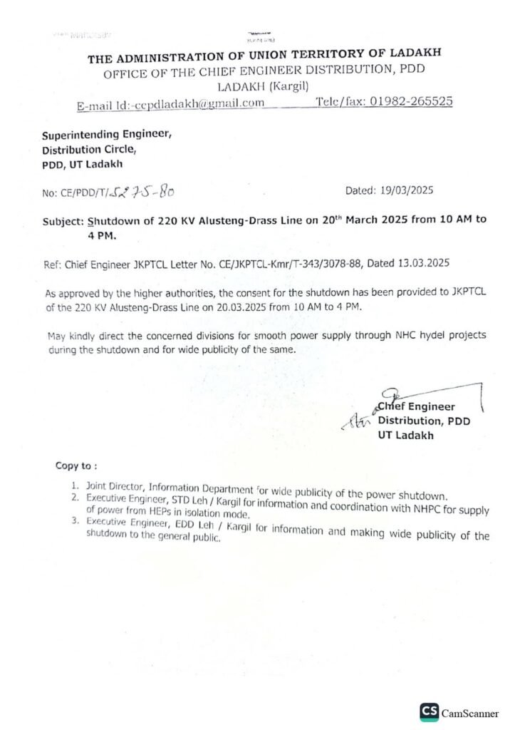 Shutdown of 220 KV Alusteng -Drass Line on 20th March 2025 from 10am to 4pm Diplomat Digital 12 months ago Read the notice for more details