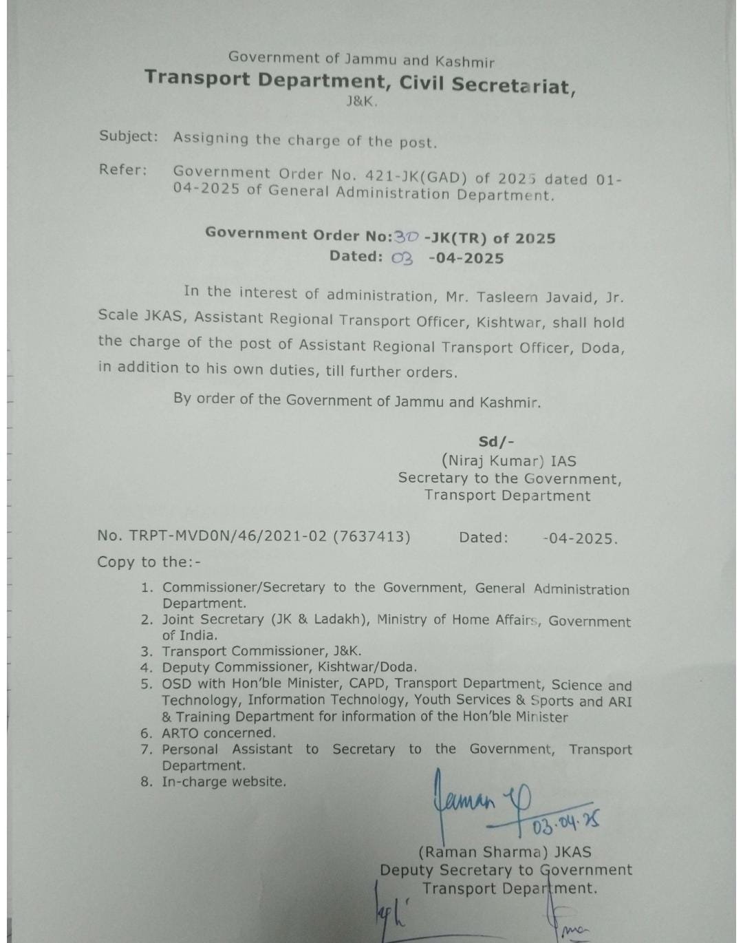 Kishtwar,DD, Jammu and Kashmir’s Transport Department has officially assigned Tasleem Javaid, Junior Scale JKAS officer and Assistant Regional Transport Officer (ARTO) Kishtwar, the additional charge of ARTO Doda. The decision, issued under Government Order No. 30-JK(TR) of 2025, dated April 3, 2025, is in the interest of administration and will remain effective until further orders.