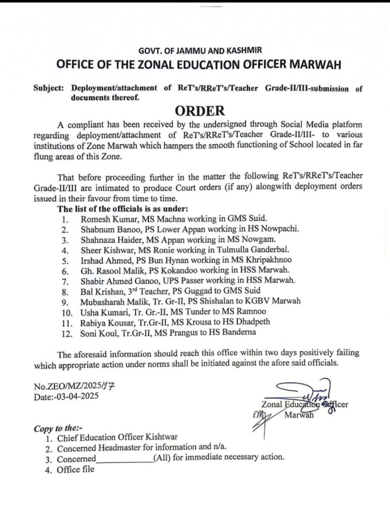 Marwah, DD, The Office of the Zonal Education Officer (ZEO) Marwah has issued an official order directing certain teachers, including Rehbar-e-Taleem (ReT) and Regularized ReT (RReT) educators, to submit their deployment and court orders within two days. The directive comes in response to concerns raised on social media regarding the unauthorized deployment of teachers, which has allegedly disrupted the functioning of schools in remote areas of the zone.