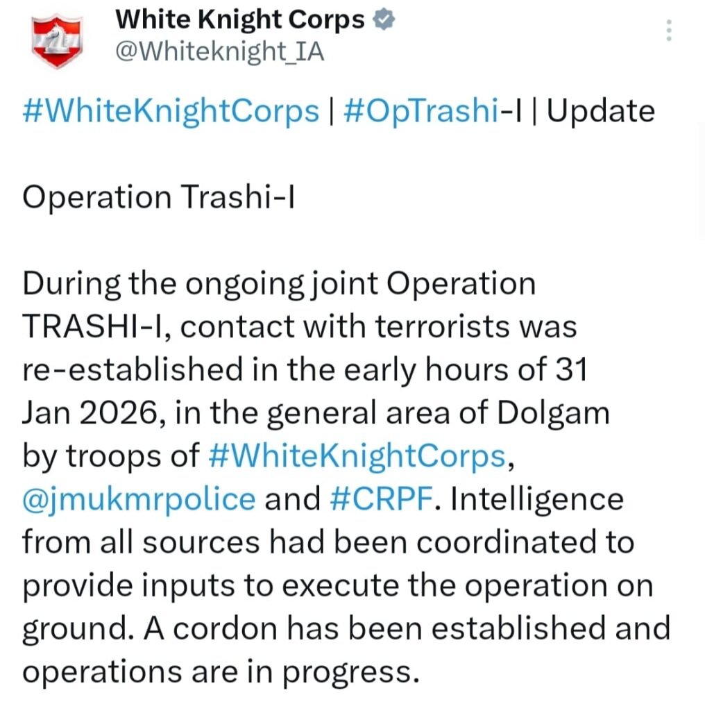The White Knight Corps on X handle informed that, “During the ongoing joint operation TRASHI-I, contact with terrorists was re-established in the early hours of 31 January 2023 in the general area of Dolgam by troops of the White Knight Corps, J&K Police, and CRPF.”