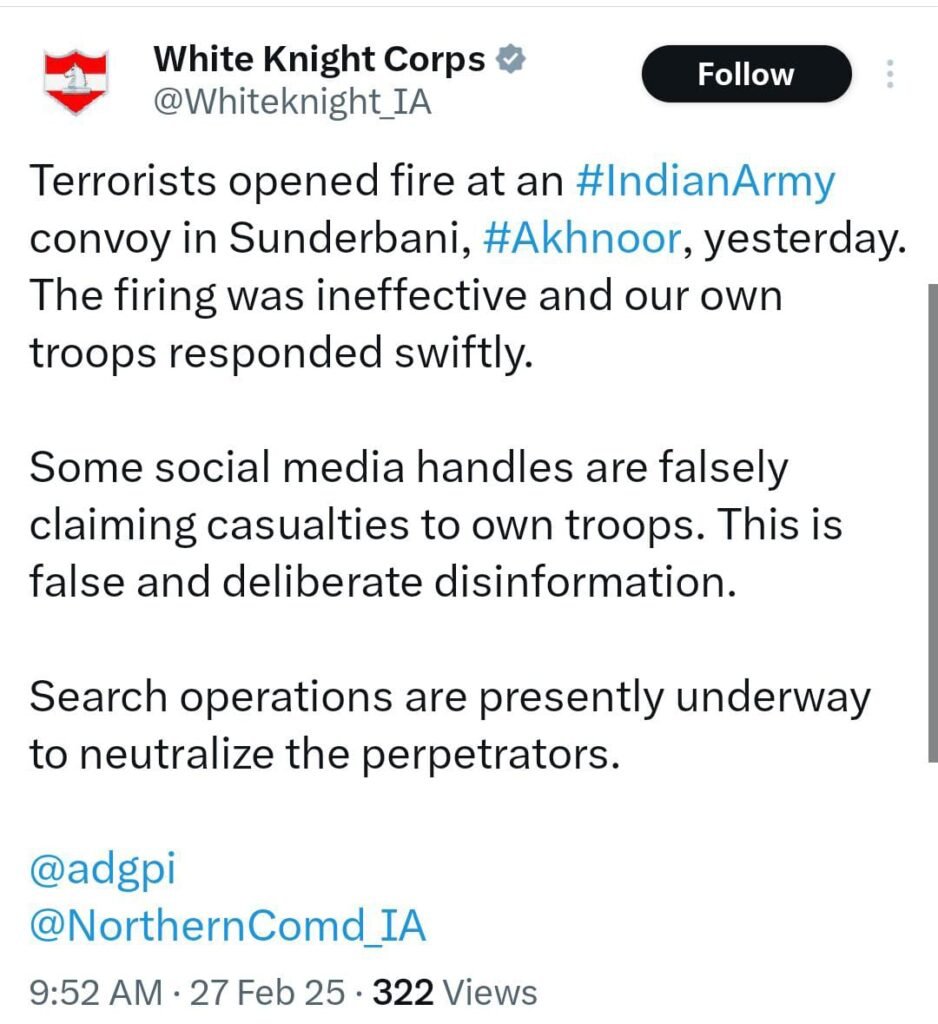 Rajouri: DD, The terrorists have opened fire at an Indian Army convey in Sunderbani, Akhnoor on February 26, 2025.