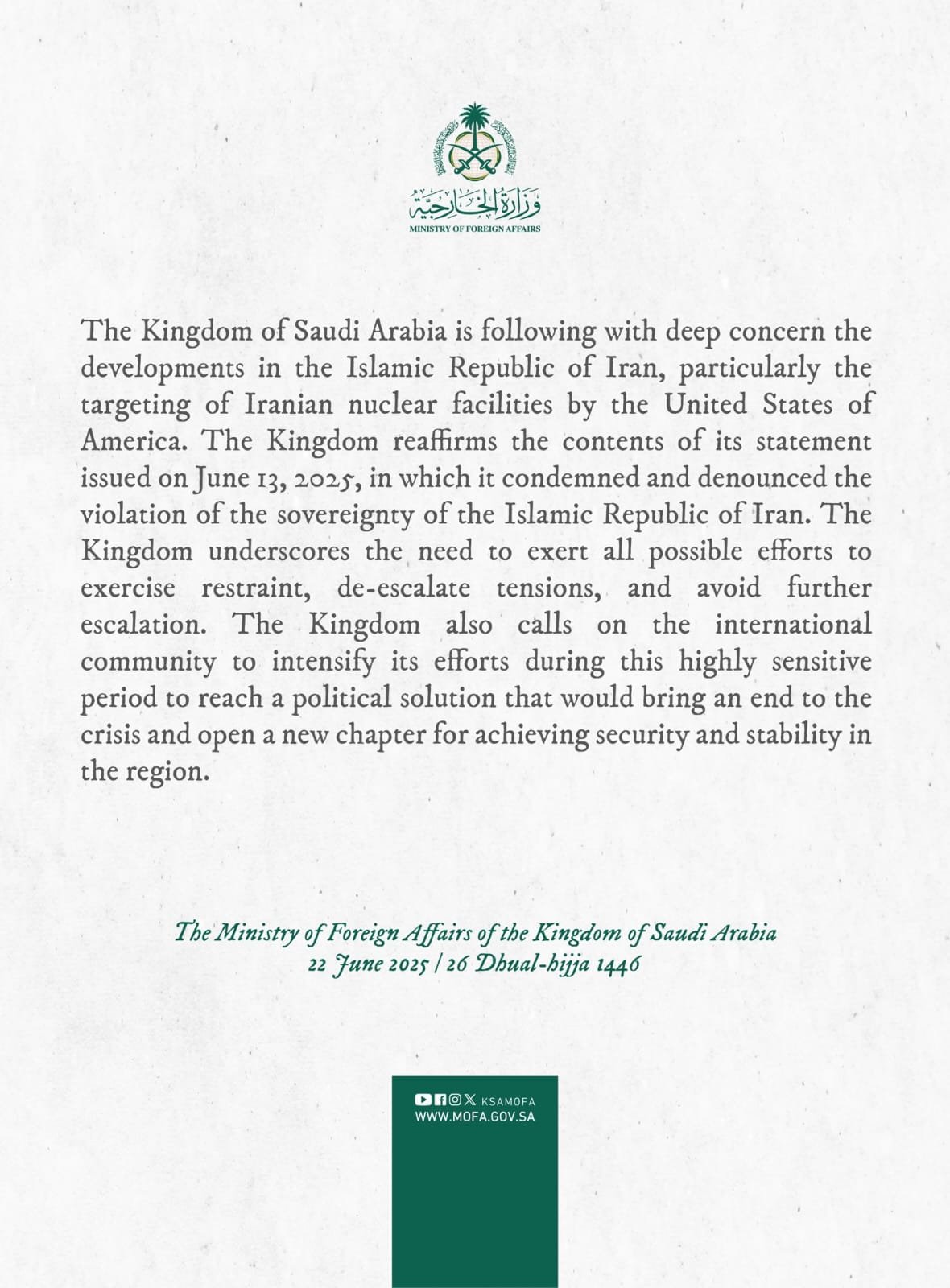 The Kingdom of Saudi Arabia is following with deep concern the developments in the Islamic Republic of Iran, particularly the targeting of Iranian nuclear facilities by the United States of America.