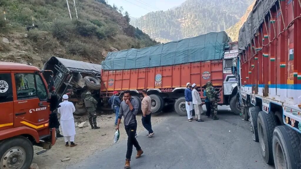 Udhampur :TDD, A major traffic disruption occurred on the strategic Jammu-Srinagar National Highway (NH44) today following a three-truck collision near Nachlana in Ramban district, Jammu and Kashmir. The accident, which took place early this morning, resulted in both sides of the highway being blocked, leading to significant delays for commuters and transport vehicles. Emergency services were immediately dispatched to the scene to assess the situation and provide assistance to any injured individuals. Thankfully, no casualties were reported.