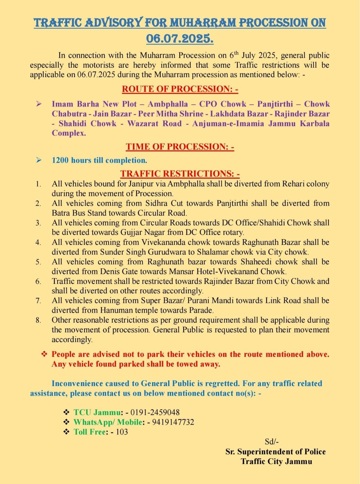 LATEST NEWS Div Com and IGP Jammu review arrangements at M A stadium Know where the Power to remain shutdown CBI Arrests Two Public Servants in Bribery Case JU organizes General Zorawar Singh Memorial Public Lecture on “China’s Cognitive Warfare Ecosystem: Implications and Response by India” Indian Army Signs MOU with Podar Education Network to Support Wards of Soldiers Jammu Less than 1 min.Read Traffic Advisory for Muharram Procession in Jammu City dated 6.7.2025 By Diplomat Digital July 5, 2025 FacebookTwitterPinterestWhatsApp Hot this week Jammu Div Com and IGP Jammu review arrangements at M A stadium January 17, 2026 0 Diplomat Correspondent JAMMU: Divisional Commissioner Jammu, Ramesh Kumar and... Jammu Know where the Power to remain shutdown January 17, 2026 0 Diplomat Correspondent JAMMU, Chief Engineer (Distribution) JPDCL Jammu... Jammu CBI Arrests Two Public Servants in Bribery Case January 16, 2026 0 Diplomat CorrespondentJammu: The Central Bureau of Investigation (CBI) has... Jammu JU organizes General Zorawar Singh Memorial Public Lecture on “China’s Cognitive Warfare Ecosystem: Implications and Response by India” January 16, 2026 0 Diplomat Correspondent Jammu: The Department of Strategic and Regional... India Indian Army Signs MOU with Podar Education Network to Support Wards of Soldiers January 16, 2026 0 Diplomat Correspondent New Delhi: The Indian Army has signed... Topics Jammu Div Com and IGP Jammu review arrangements at M A stadium 0 Diplomat Correspondent JAMMU: Divisional Commissioner Jammu, Ramesh Kumar and... Jammu Know where the Power to remain shutdown 0 Diplomat Correspondent JAMMU, Chief Engineer (Distribution) JPDCL Jammu... Jammu CBI Arrests Two Public Servants in Bribery Case 0 Diplomat CorrespondentJammu: The Central Bureau of Investigation (CBI) has... Jammu JU organizes General Zorawar Singh Memorial Public Lecture on “China’s Cognitive Warfare Ecosystem: Implications and Response by India” 0 Diplomat Correspondent Jammu: The Department of Strategic and Regional... India Indian Army Signs MOU with Podar Education Network to Support Wards of Soldiers 0 Diplomat Correspondent New Delhi: The Indian Army has signed... Jammu DPC process to go digital soon; CS takes appraisal of the portal 0 Diplomat Correspondent JAMMU: Chief Secretary, Atal Dulloo, today took... Jammu Lieutenant Governor Manoj Sinha Inaugurates Exhibition at IIM 0 Diplomat Correspondent Jammu, Jammu’s International Painters Symposium 2026 Valedictory... Ladakh DGP Ladakh Mukesh calls on LG Kavinder Gupta in Leh 0 Diplomat Correspondent Leh: Director General of Police, Union Territory... Related Articles Div Com and IGP Jammu review arrangements at M A stadium Jammu January 17, 2026 Know where the Power to remain shutdown Jammu January 17, 2026 CBI Arrests Two Public Servants in Bribery Case Jammu January 16, 2026 JU organizes General Zorawar Singh Memorial Public Lecture on “China’s Cognitive Warfare Ecosystem: Implications and Response by India” Jammu January 16, 2026 DPC process to go digital soon; CS takes appraisal of the portal Jammu January 16, 2026 Previous articleSadhotra seeks strengthening of internet connectivity on Baltal, Pahalgam routes for smooth Amarnath YatraNext articleCouple Held for Brutal Murder in Kishtwar; Body Found in Abandoned Car