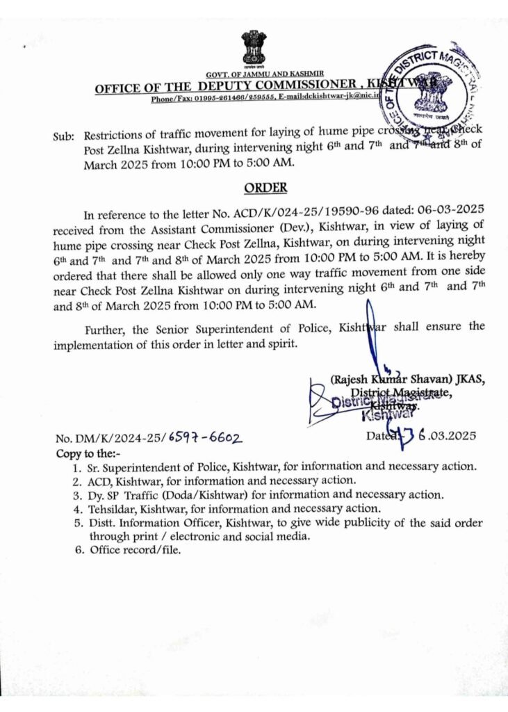 Kishtwar,DD, The Deputy Commissioner of Kishtwar has issued an official order restricting traffic movement near Check Post Zellna for the laying of hume pipes. The restrictions will be in effect during the intervening nights of March 6th-7th and March 7th-8th, 2025, from 10:00 PM to 5:00 AM.