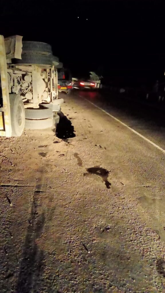Udhampur,TDD, A truck overturned on the Jammu-Srinagar National Highway near Toldi Nallah in Udhampur district on Friday, resulting in injuries to the driver.