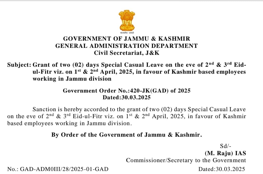 Two days special casual leave grants to Kashmir based employees working in Jammu