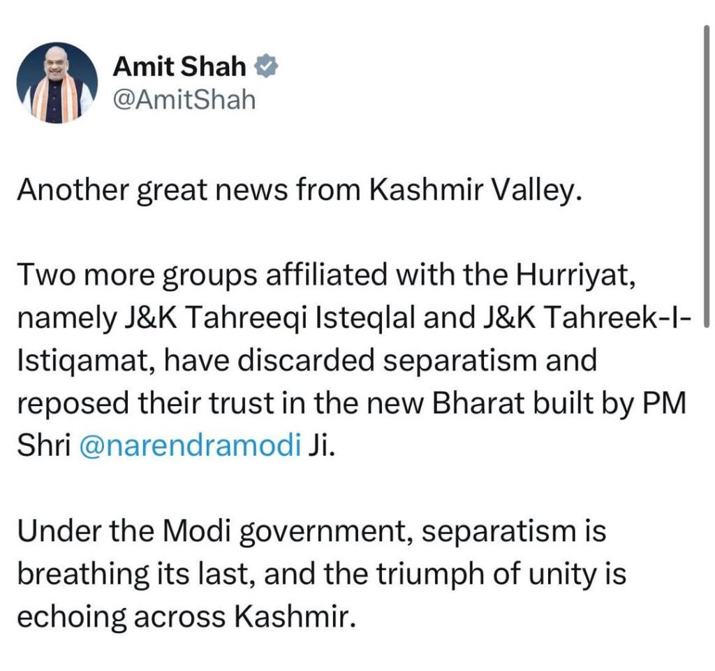 Welcoming the move, Amit Shah asserted that “Separatism has become history in Kashmir,” crediting the Modi government’s policies for the shift. “The unifying vision of PM Modi has tossed separatism out of Jammu and Kashmir. I urge others to abandon separatist ideology and contribute to the nation’s progress,” Shah posted on X.