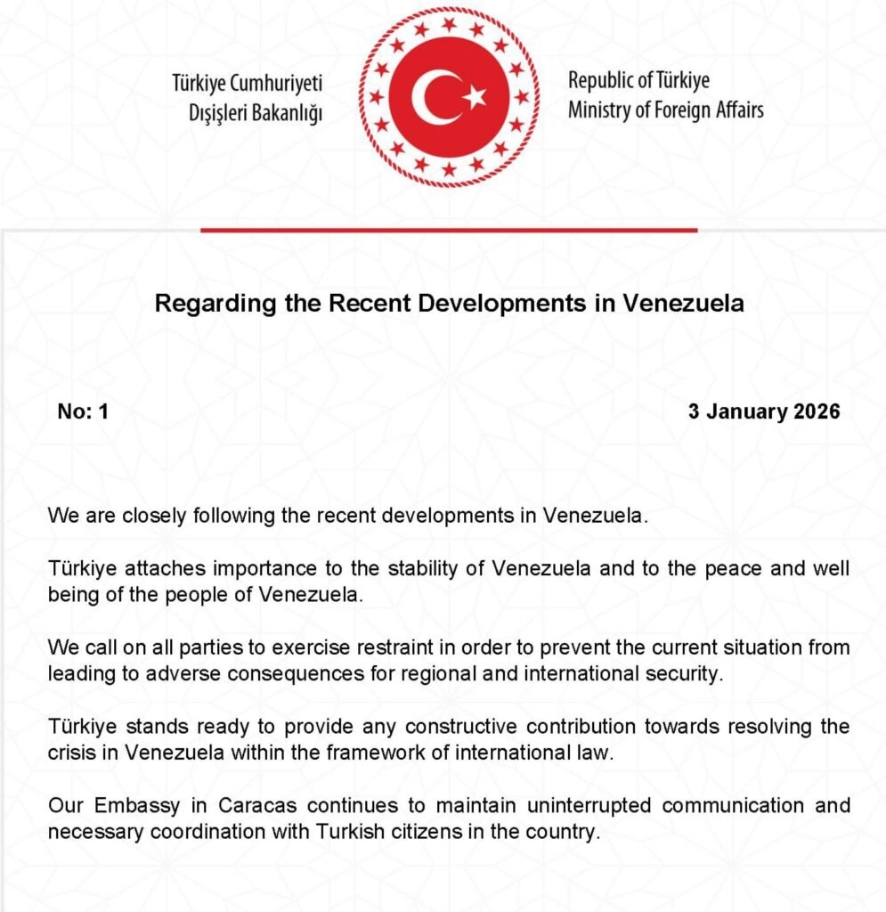“Our Embassy in Caracas continues to maintain uninterrupted communication and necessary coordination with Turkish citizens in the country”, the official statement reads following disturbing development in Venezuela.