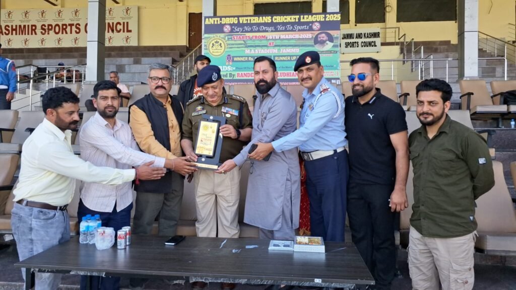 Jammu Mar 22,DD: Veterans Crickets League 2025 organised by Ludhiana Brother in collaboration with Team Jammu at MA Stadium, Jammu here on the 6th day of Anti-Drug. The match was played between Ever Shine Cricket Club with Trikuta Cricket Club and Anti Corruptions Bureau with Progressive Cricket Club. In the first match, Ever Shine registered a victory by 15 runs. Batting first, Ever Shine set a target of 175/6 in 20 overs. Manjeet Singh and Chamkor Singh contribute 56 runs in 40 balls and 42 runs in 31 ball from Trikuta Cricket club Gurvinder got 2 Wickets. In reply, Trikuta Cricket Club 160/7 in 20 overs. Sunny Choudhary made 57 runs in 38 balls. From Ever Shine Ravinder Singh and Dharmendra got 2 wickets each respectively.Chamkor Singh was the player of the match.In second match, Anti Corruption Bureau won by 3 runs. Batting first Anti Corruptions Bureau set a target of 121/10 in 17.2 overs. Manider made 40 runs in 23 balls. from Bowleing side, Lakhbinder and Vikas got 4 wickets and 2 wickets.in reply, Progressive Cricket Club made 118/8 in 20 overs. Dr Vishav Partap Scored 22 runs in 20 balls and Sanju contribute 19 runs in 36 balls. From ACB Cricket Club Vishal Choudhary got 2 Wickets.Manider Was the player of the match. Today guest of the match is SSP Traffic, Feisal Quareshi. The match was started by SSP Traffic, Feisal Quareshi with Team Jammu Chairman, Zorawar Singh and Randeep Singh (Ludhiana Brothers) by getting toss done between the teams. DD