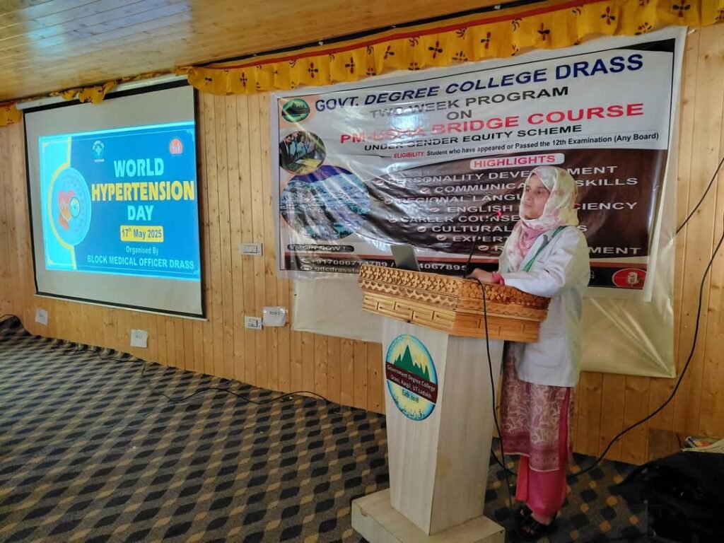 Kargil, May 17, 2025,DD: On the occasion of World Hypertension Day, Govt. Degree College Drass, in collaboration with the Sub-Divisional Hospital Drass, organized an awareness program focusing on the 2025 theme: “Measure Your Blood Pressure Accurately, Control It, Live Longer.”The event featured a series of informative talks aimed at spreading awareness about hypertension and related health concerns. Dr. Anjum delivered a detailed lecture on hypertension, highlighting its causes, preventive measures, and the importance of early detection and lifestyle management. In addition, Dr. Mehdi gave an insightful talk on diabetes, its root causes, and strategies for prevention.